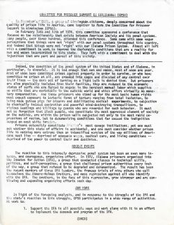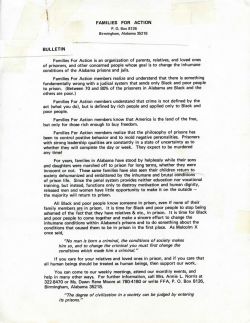 Alabama’s prisons were overcrowded and prisoners were routinely denied basic essentials such as clean drinking water and eating utensils, while being subjected to violence and extended periods of solitary confinement. To call attention to their demands for improved conditions, prisoners organized as Inmates for Action (IFA), and engaged in work stoppages and strikes in Alabama’s Atmore and Holman prisons. IFA also led classes for prisoners on subjects such as Revolutionary Theory and Black History. In response to prisoner activism, prison guards tortured and murdered IFA leaders Chagina (George Dobbins), Yukeena (Tommy Dotson) and Frank X. Moore. Furthermore, guards continued to deny access to necessities, and attempted to repress continued organizing among the prisoners. Outside of prison, the Committee for Prisoner Support in Birmingham (CPSB) and the Atmore-Holman Defense Committee planned demonstrations, assisted with legal strategy in support of IFA and campaigned for accountability for the murders.